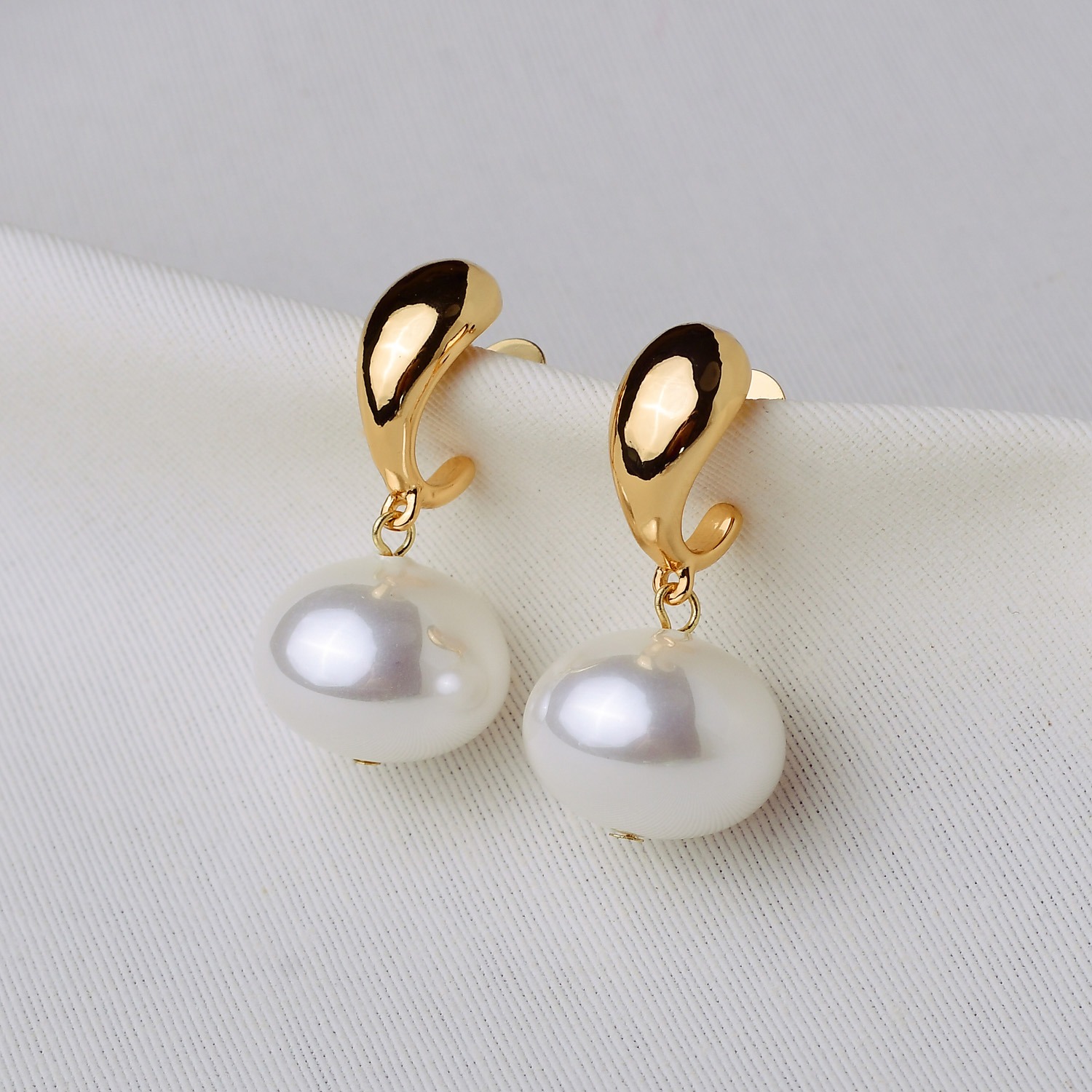 BRINCO BANHO OURO 18K ORELHA GOTA LONGA CURVADA LISO PINGENTE PEROLA SHELL ACHATADA