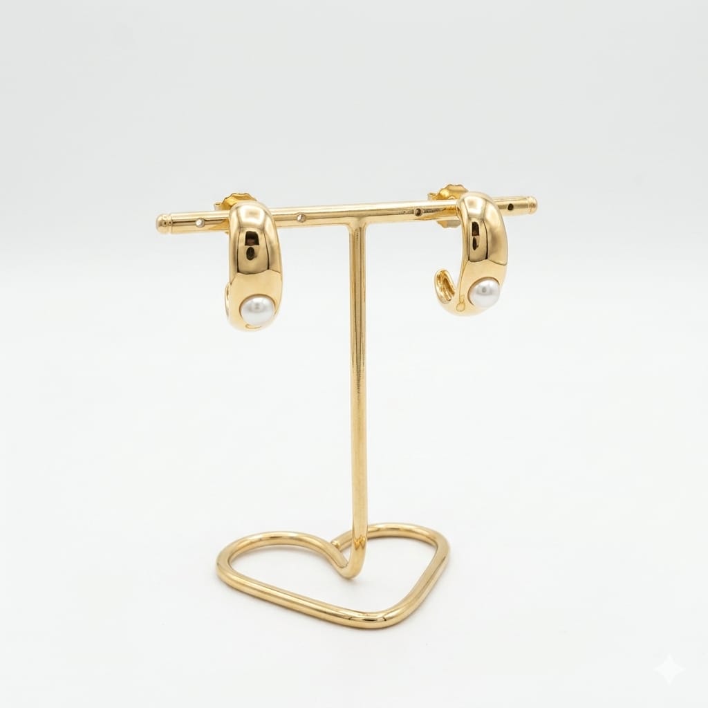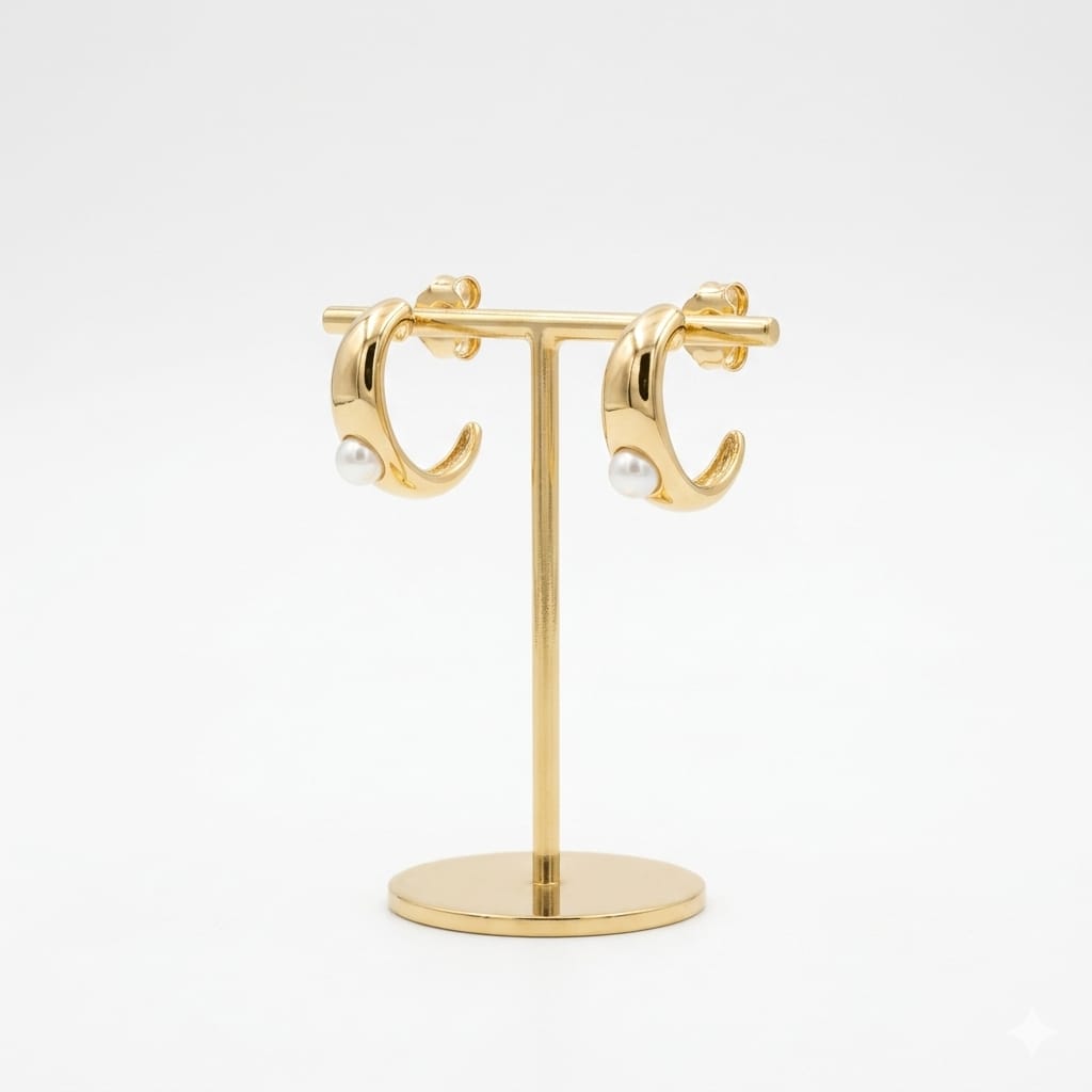 BRINCO BANHO OURO 18K CURVADO LONGO TIPO C OCO C/ PEROLA FIXA HASTE LISA