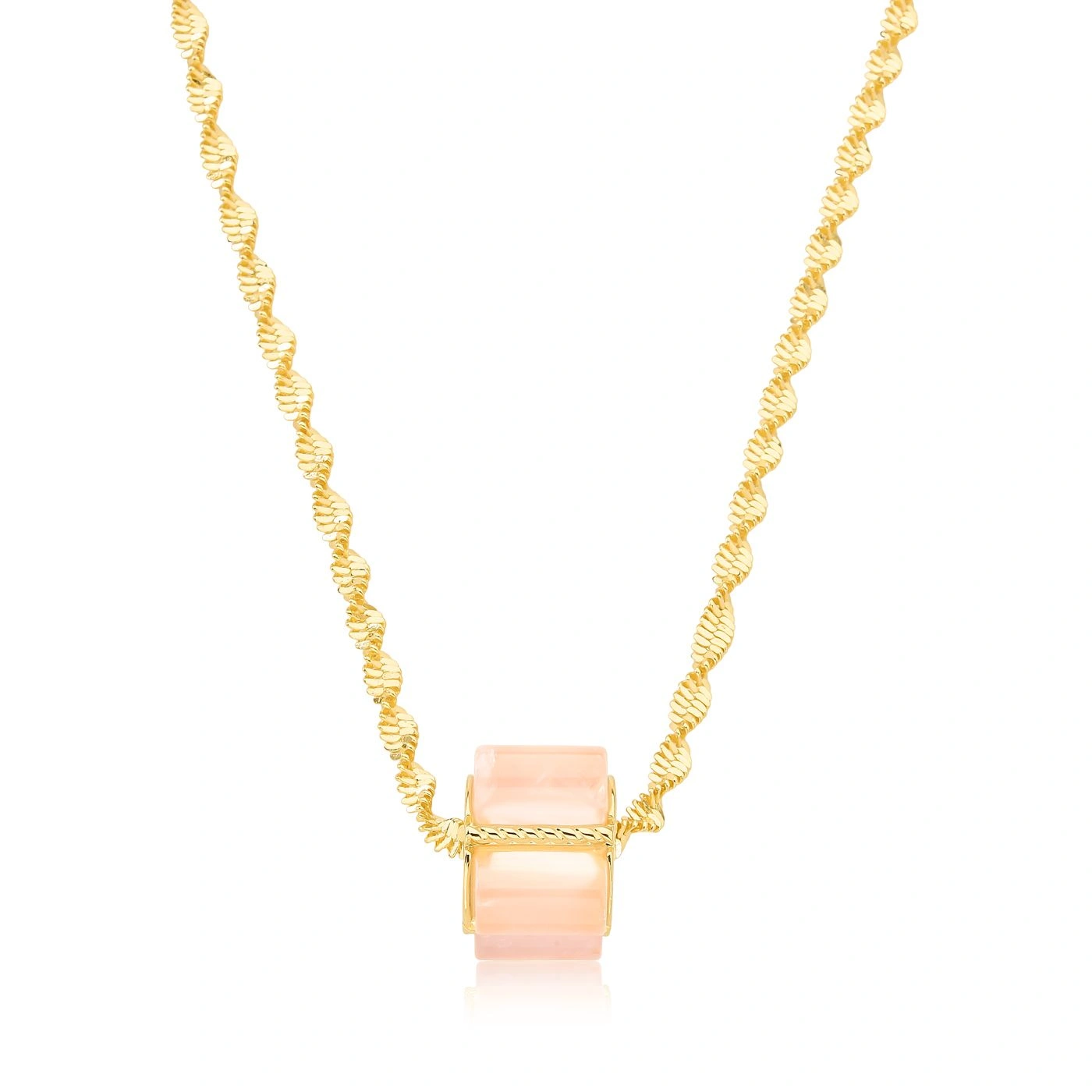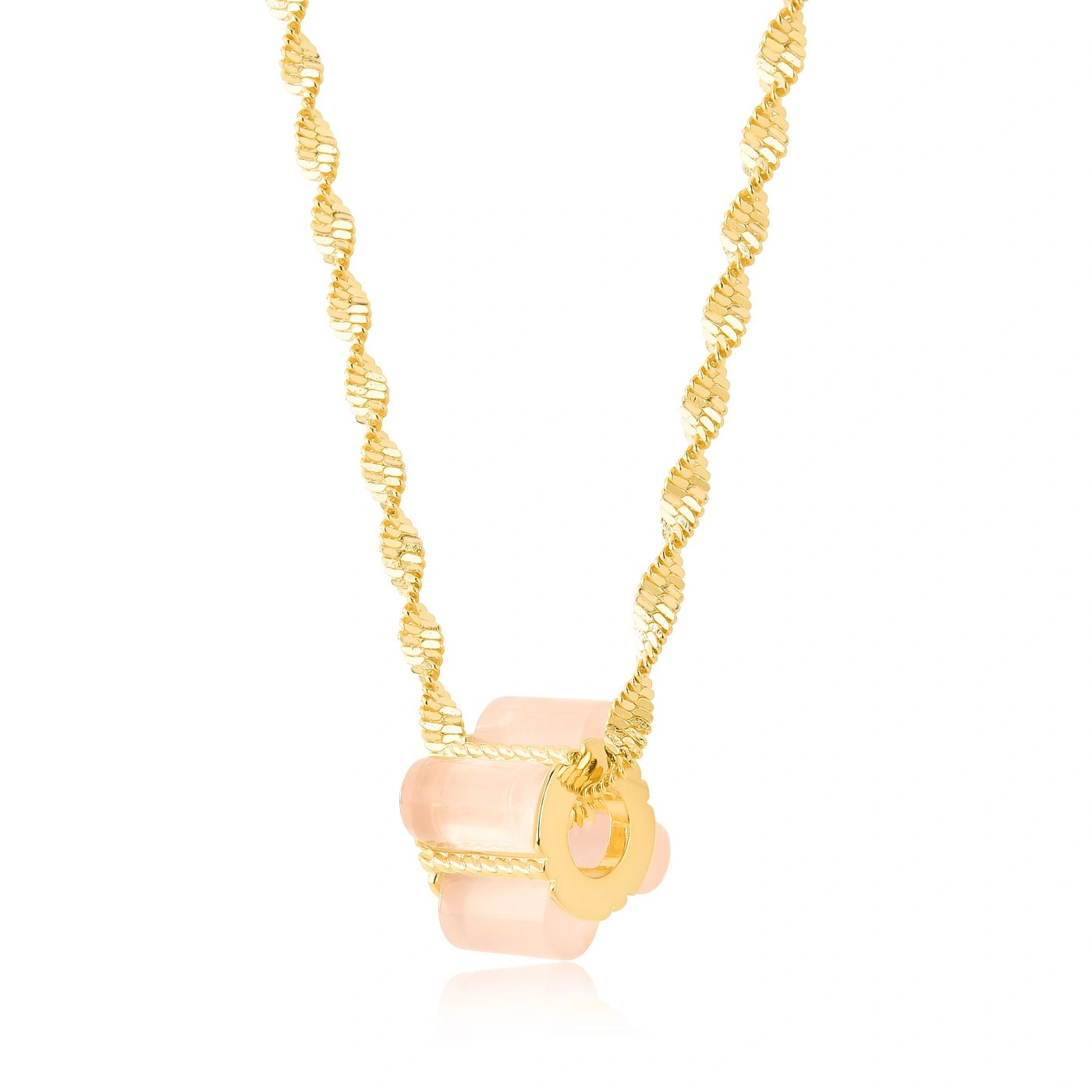 COLAR BANHO OURO 18K TORCIDO BASE ONDULADO REDONDO PEDRA QUARTZO ROSA